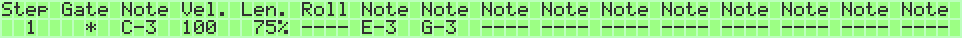 The setting Sustain on the MODE page is good to keep in mind when setting up a track to play chords or long single notes. Sustain holds each note/chord until another one is played on the track, and this spares you the trouble of having to set the length of each individual note/chord.