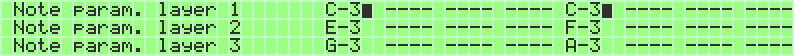 Chord tracks are set up length and layer wise just like note tracks. However, in a chord track, parameter layer A is a chord layer instead of a note layer. The chord layer doesn't take normal notes as input, but instead a value from A-P to a-p (plus octave value from 0 to 3), each of which represents a pre-defined chord. The list of the predefined chords is found below.