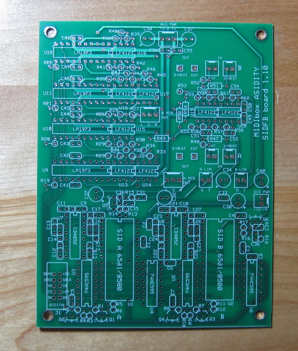 The circuit boards came in the mail today from ExpressPCB! Four custom MBHP_SIDFB module boards, each containing containing two SIDs, six channels of digitally controlled feedback and audio outputs per SID, and a CD4052-based circuit to switch between four pairs of filter capacitors.