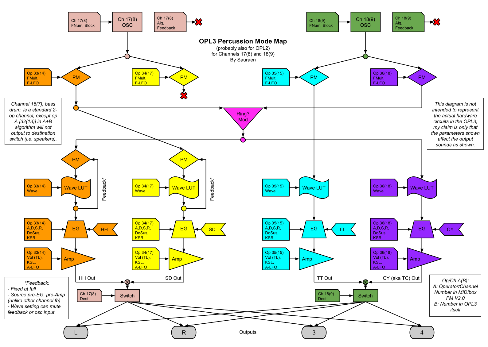 I've looked for a clear explanation of all the parameters in the OPL3's percussion mode, but I've never found one. So I sat down with my MIDIbox FM V2.0 Prototype and drew a diagram of what parameters influence what sound, with a vaguely accurate idea of how they do so. To be clear, these are the parameters for the two channels and four operators that are made into HH/SD/TT/CY within the OPL3, not any parameters specific to MIDIbox FM V2.0.