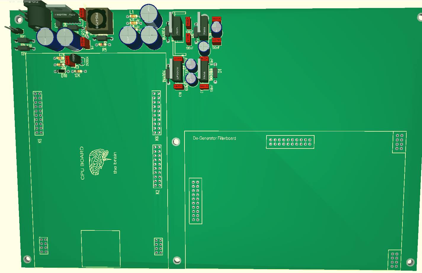 Just Andre sent me the first psb-designe from the motherboard of Degenerator. On left top site is the position from power connector and negativ switching regulator P3596. Under the regulator the components of the voltage monitoring. These Components are covered by the CPU board. Right next to the negativ switching regulator position 4 liniar voltage regulators for + 3.3V + 5V + 8V -8 Volt. For the + 5V regulator