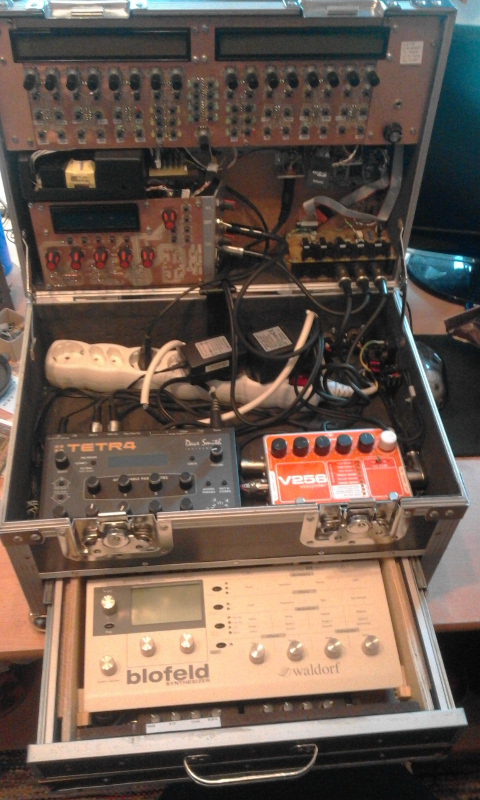 Sequencer box built inside a cheap Wisent tool box (from a recycling center). Contents: MBSEQv4, MBSIDv2 (with noise gate and SSM2044 filters), two sample players (one for mellotron and drum samples, another one for the drummer's tempo track), DSI Tetra, EHX V256 vocoder, Waldorf Blofeld, 2x Behringer MX400 mixers.