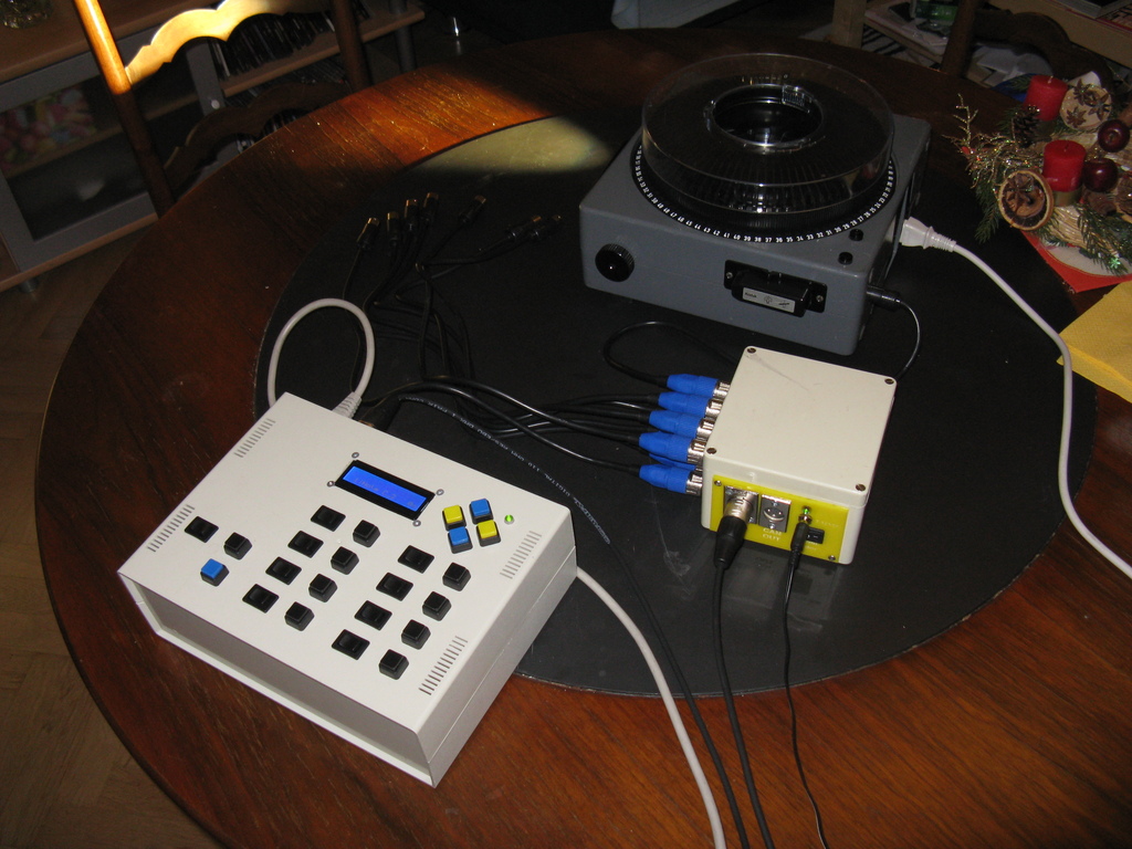 The stagebox on the left, distrobox in the middle, and controlled slide projector on top. Nice. :D