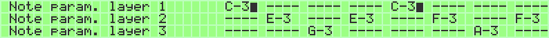Chord tracks are set up length and layer wise just like note tracks. However, in a chord track, parameter layer A is a chord layer instead of a note layer. The chord layer doesn't take normal notes as input, but instead a value from A-P to a-p (plus octave value from 0 to 3), each of which represents a pre-defined chord. The list of the predefined chords is found below.