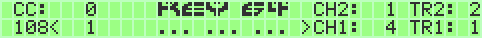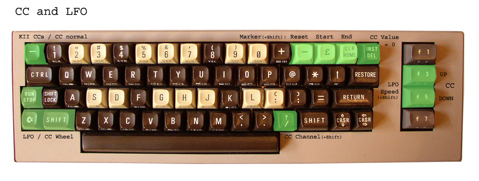 On the right side of screen the adjustable CC and CC Values are shown. The pointer char “>” infront of Midi-Channel presents the current Channel for a choosen CCs. SHIFT_R + ? switches the CC pointer between the 2 keyfields. CCs are adjustable with F3 and F5. The Keys COMMODORE and SHIFT_L presents the datawheel of K64. CC Values are sended out by moving CC Value up and down with that keys. INST/DEL Key sets values back to 0.