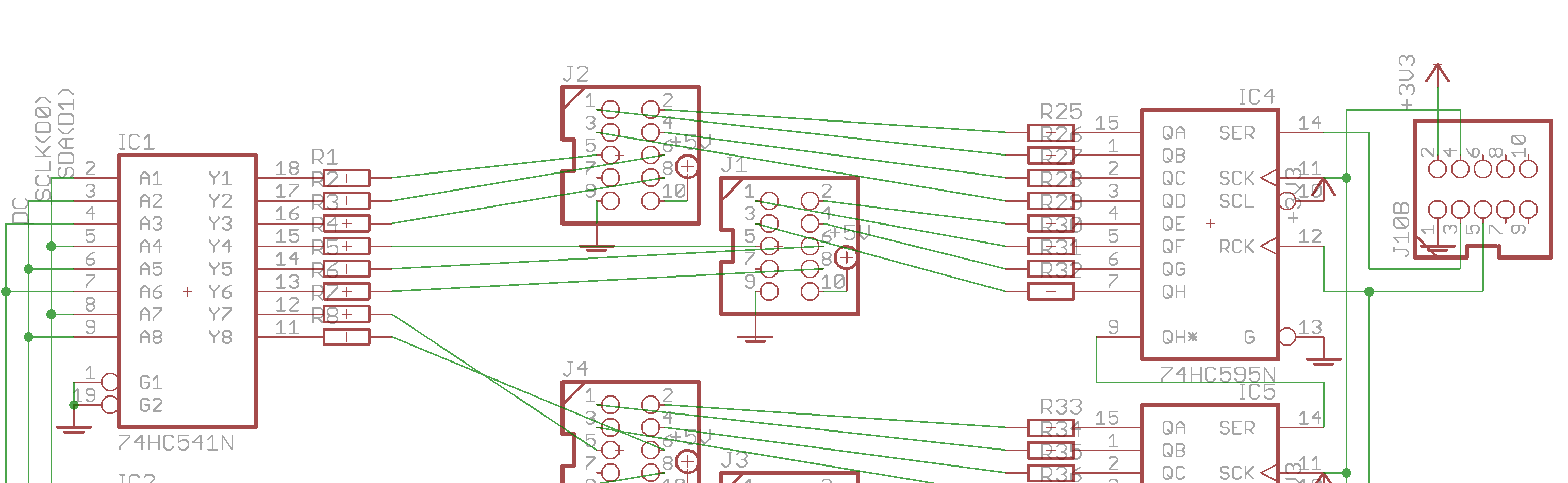 J9 is a power supply input that is sent to the displays over headers J1-J8. It may be better to wire the displays directly to the power supply rather than using the ribbon cable and connectors.