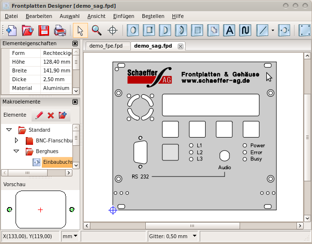 FrontPanel designer is a proprietary tool Edited By Schaeffer to draw (Aluminium) frontpanels and have them made. Schaeffer is located in Germany.
