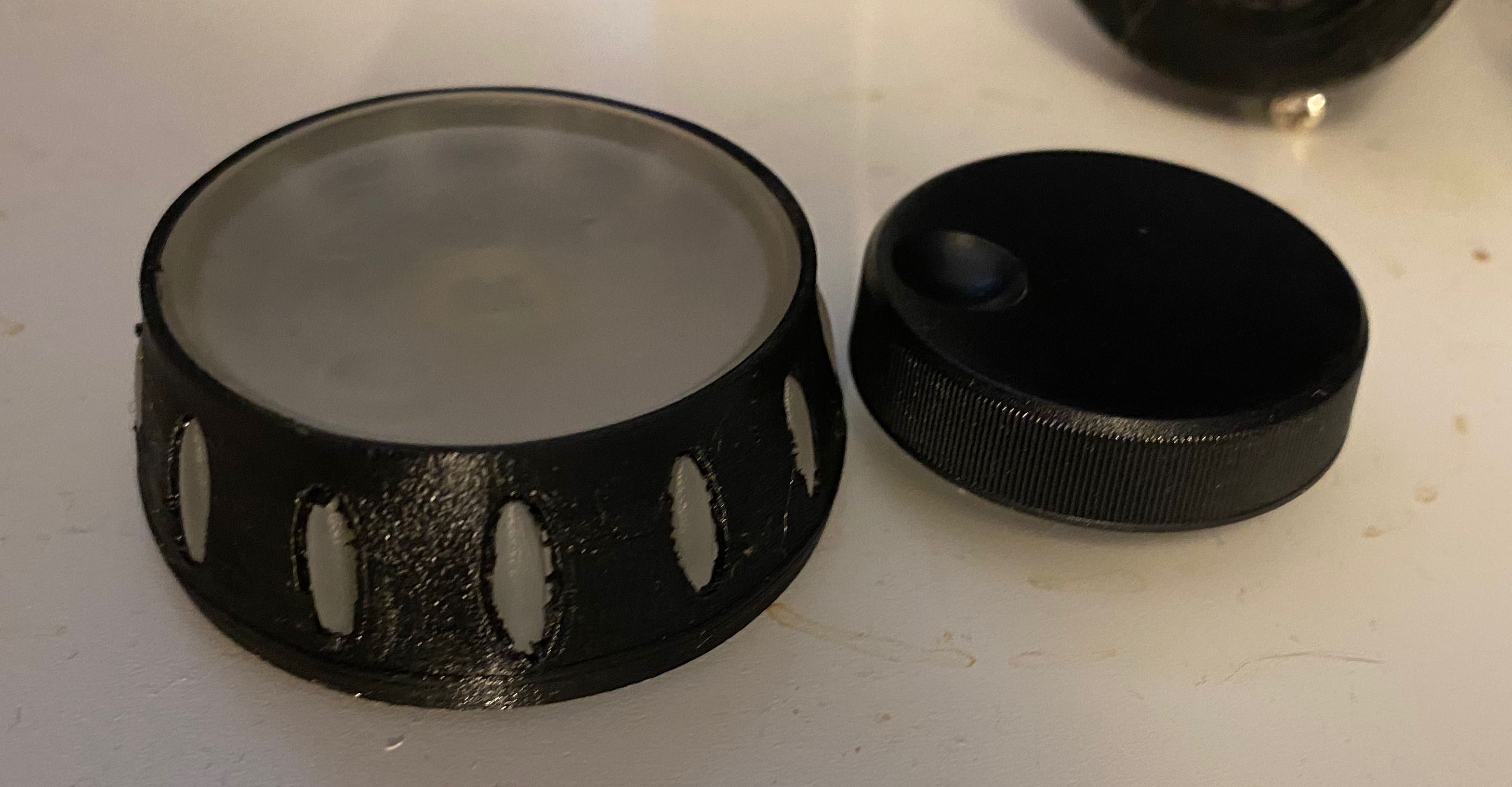 A parameterised D-shaft knob design I made. It scales well, and works for both the more usual size, and this larger jog dial size. Sadly, the bureau I used provided a very stringy rubber component.