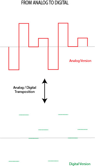 Therefore, when converted to digital form, audio has to be quantized (digitized, or divided into discrete elements) in both amplitude (voltage) and time. Here is the quantization in time: