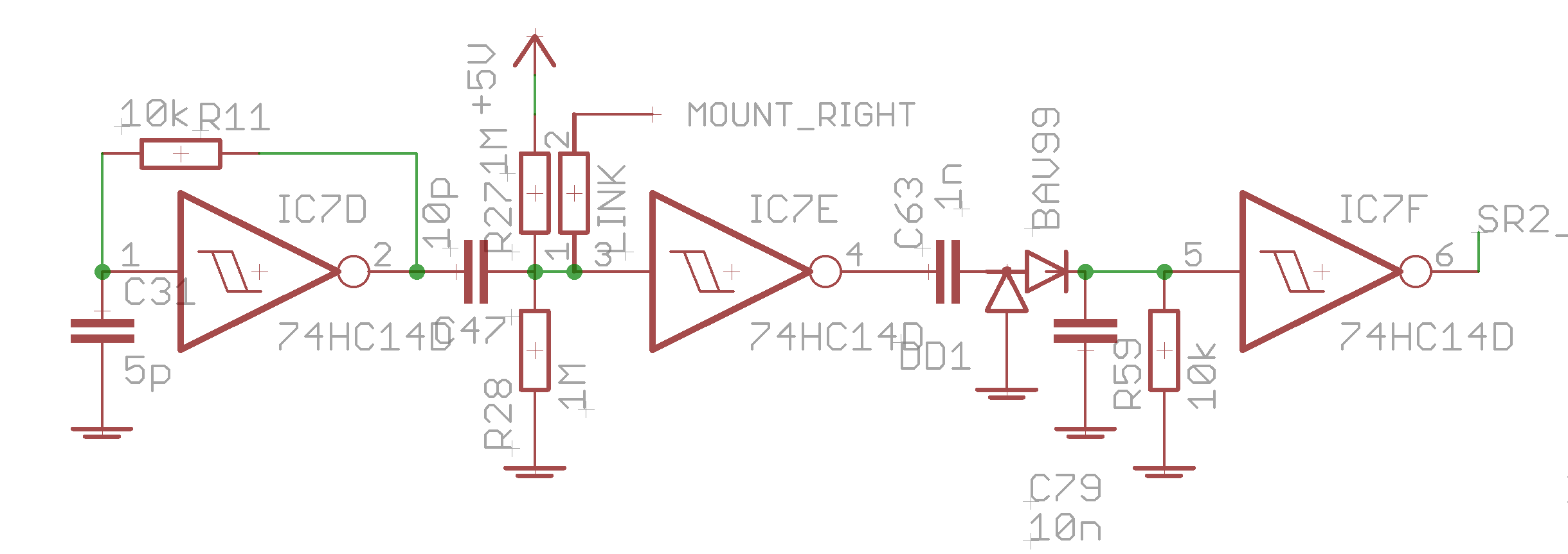 The first inverter comprises an oscillator feeding into another inverter. By touching the “LINK” part, the capacitance increases. The third inverter forms a comparator. In the normal state, the oscillator keeps the gate output low. When touched, the oscillator will “bleed” through and set the gate high. The actual part values may need adjusting to suit your own body/environment. To use plates mounted onto the encoder bodies, solder a wire link across the TS parts as noted. To use other metal pieces (e.g. an external keyboard), connect a wire to the pads adjacent to surface-mount parts.