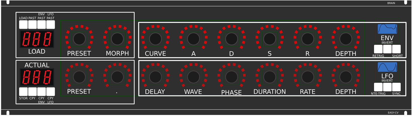 Digital created LFO+ENV with CV-Output. No Displays, No Menues, Minimal buttons, much Scopes, much Led-Ring-Rotarys (Planed for LRE-8x2CS), one big UI with complete functions for one LFO+ENV Voice… switching between the UI-Voices is done from the BREAKOUTMODULES…to this later