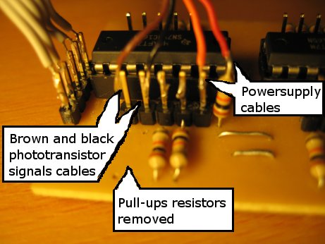 On the other side of the PCB you need to solder the two cables that will receive the signals from the phototransistors, as shown on the picture below. This will let you use the encoder that's on the left on the picture above (on the right on the picture below).