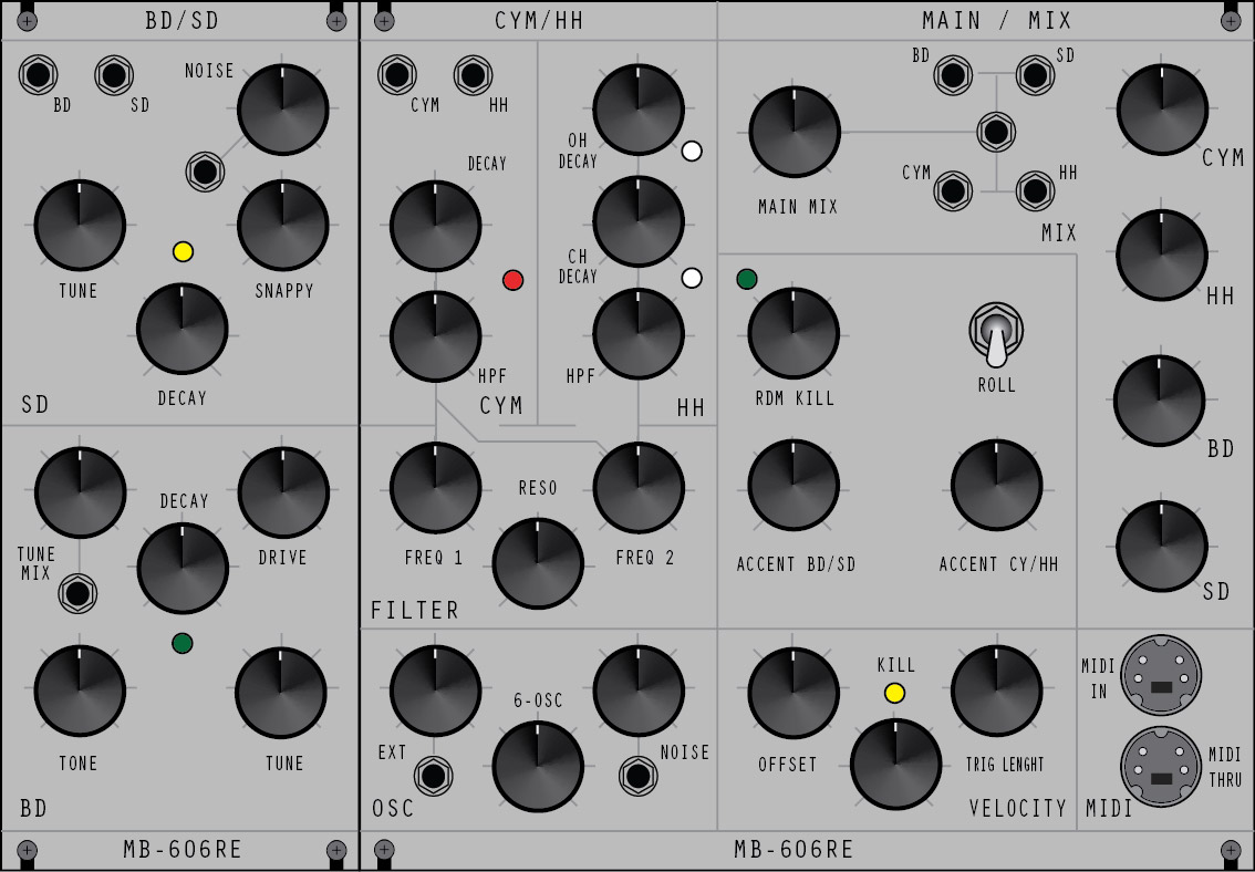 The MB-606RE is a re-edit of CYM/HH and BD/SD drum parts of the Roland TR-606 to be controlled via MIDI (midibox) or CV through analog-Sequencers , in a a Eurorack-designed panel.