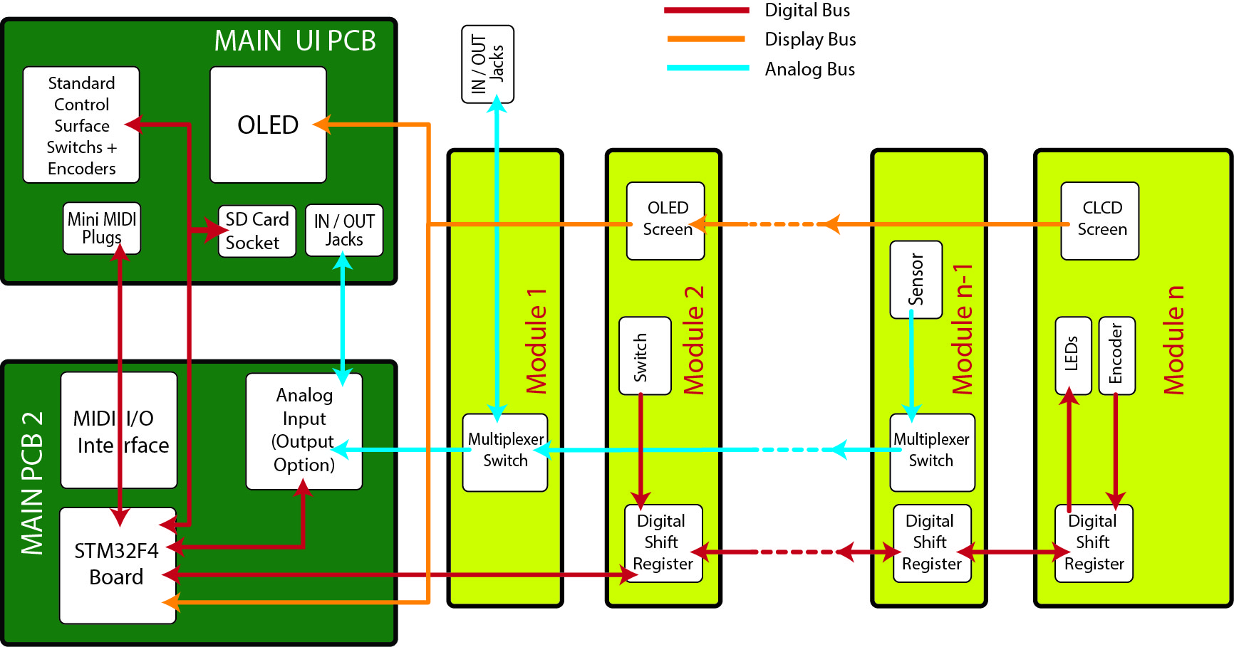 Each Small Module will have a Different type of Interaction and will include Digital Shift Registers and/or Multiplexers For Analog lines . Then modules would be chained one to another up to main part.