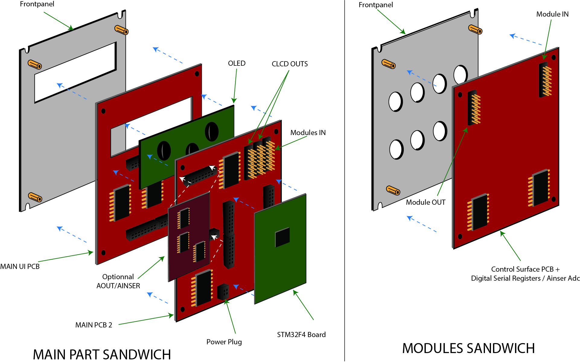Sandwich Design is ok here due to non heating components and allow to spare space. - Modules Frontpanels are 8HP-multiple wide (8HP=40,3mm) see Eurorack Specification.